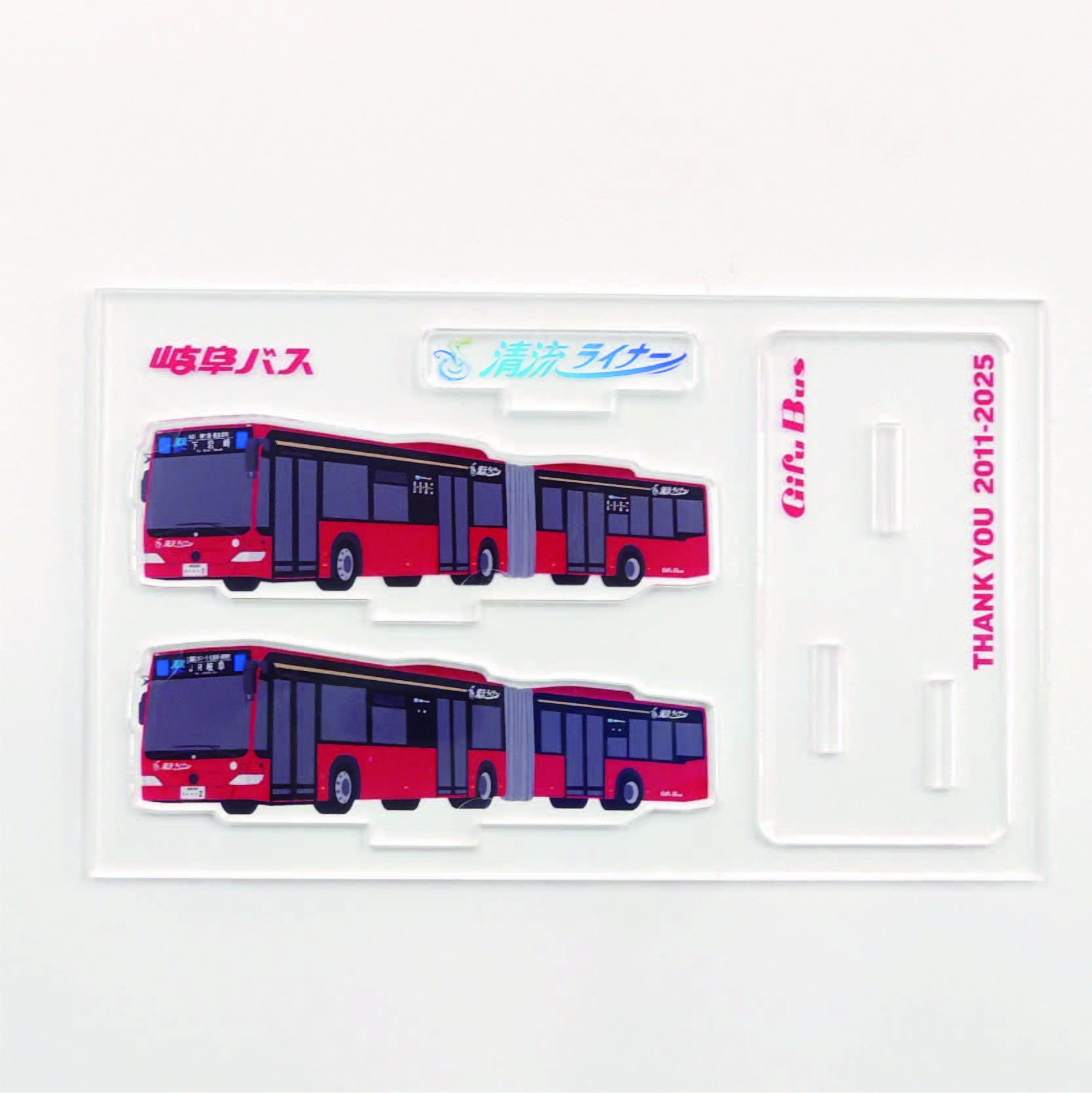 2011~2025年3月まで運行した、岐阜バス初の連節バス「清流ライナー」の1号車と2号車がならんでいます。