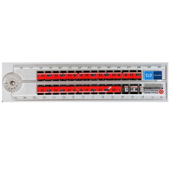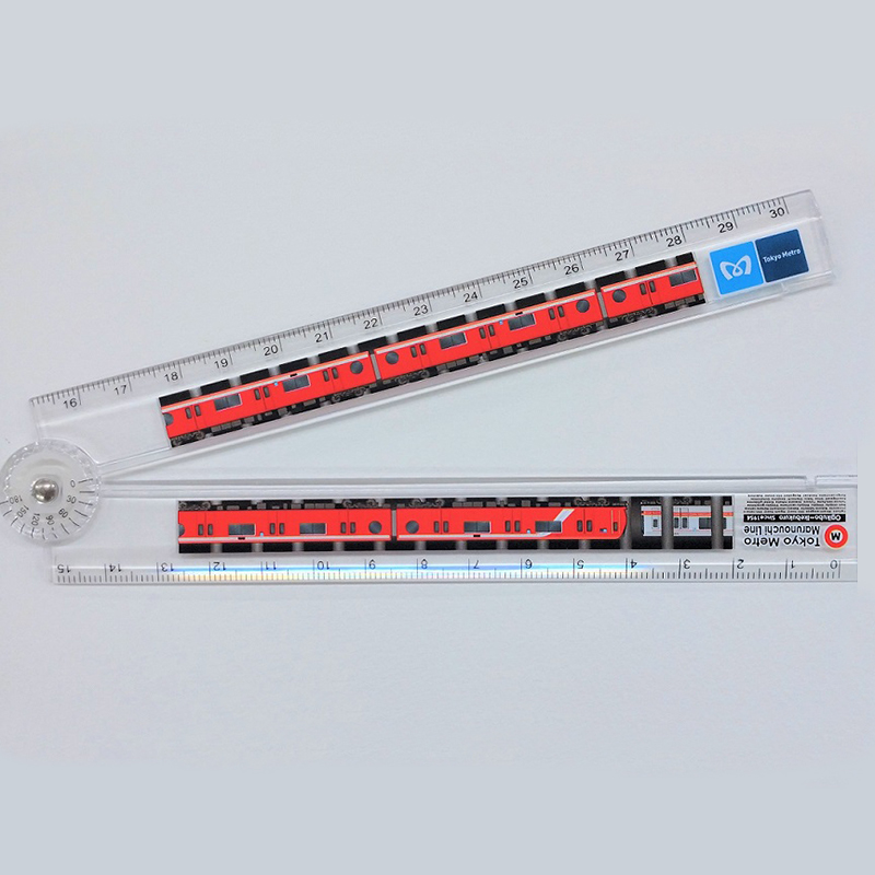 新型車両丸ノ内線2000系がシャープに描かれた折りたたみ定規。 透明のベースに真っ赤な車両が鮮やかな、まるでトンネルを走り抜けているようなかっこいいデザインです。 ※30㎝定規です。