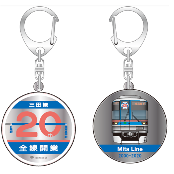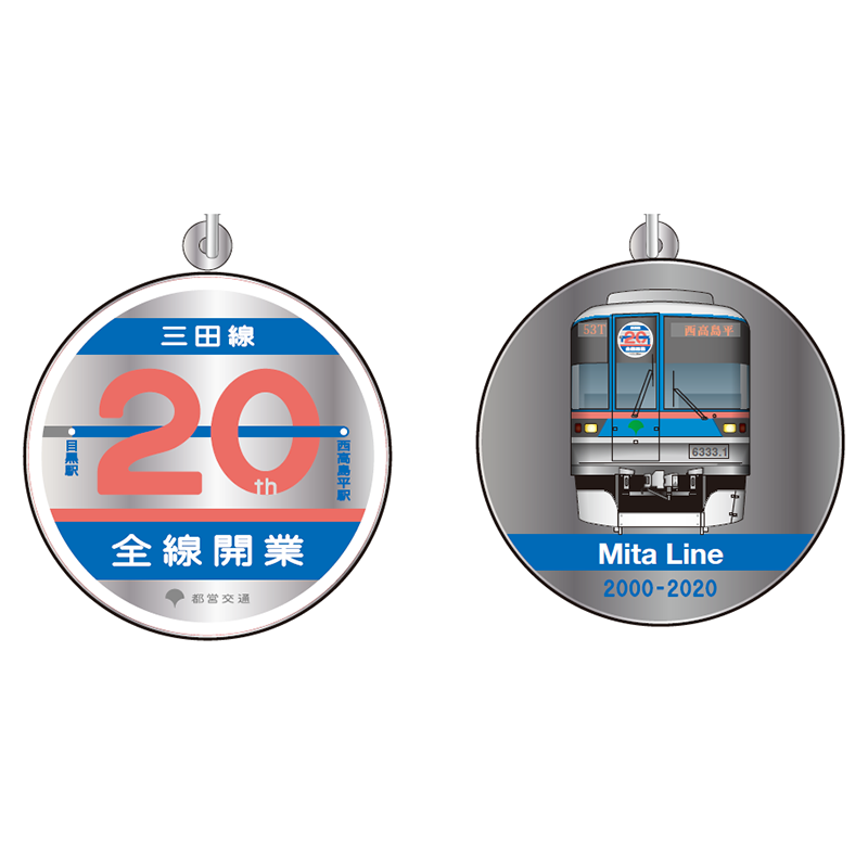表面は三田線全線開業20周年を記念したヘッドマークをデザインしたキーホルダーです。裏面には6300形車両の前面(周年記念ヘッドマーク付き)がデザインされています。