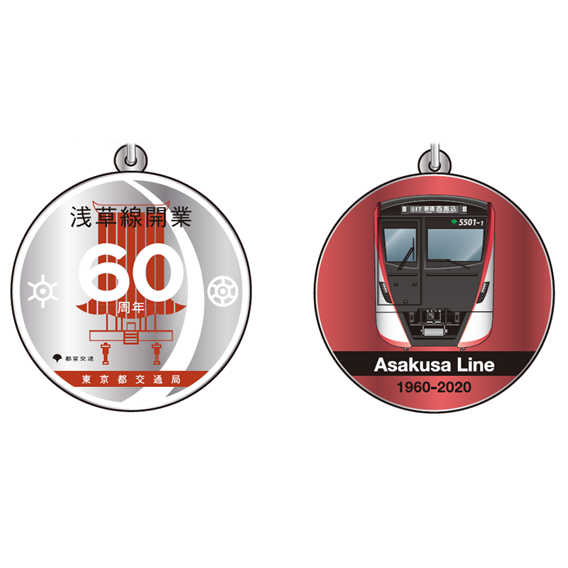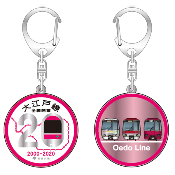 表面は大江戸線全線開業20周年を記念したヘッドマークをデザインしたキーホルダーです。裏面は12-000形車両1車両と12-600形2車両、計3車両が並んだデザインになっています。