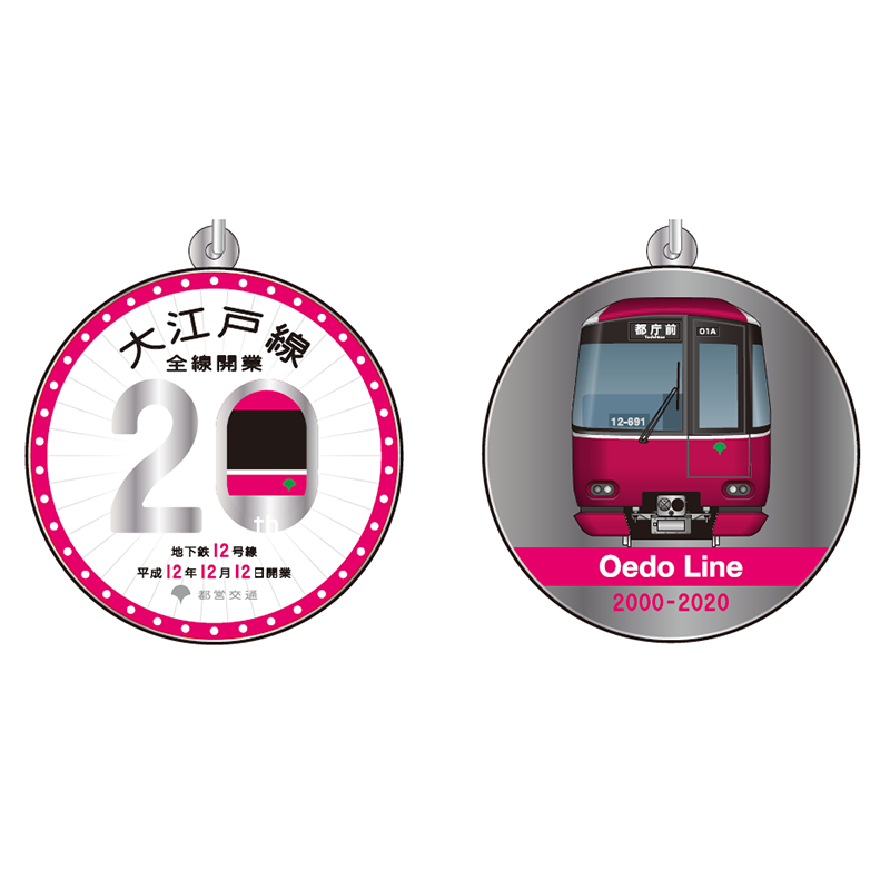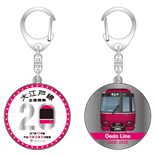 表面は大江戸線全線開業20周年を記念したヘッドマークをデザインしたキーホルダーです。裏面は12-600形車両の前面がデザインされています。