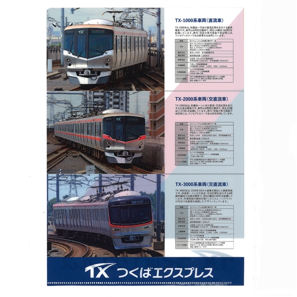 TXで走る3車種(TX-1000系、TX-2000系、TX-3000系)を線画イラストとしたクリアファイルです。