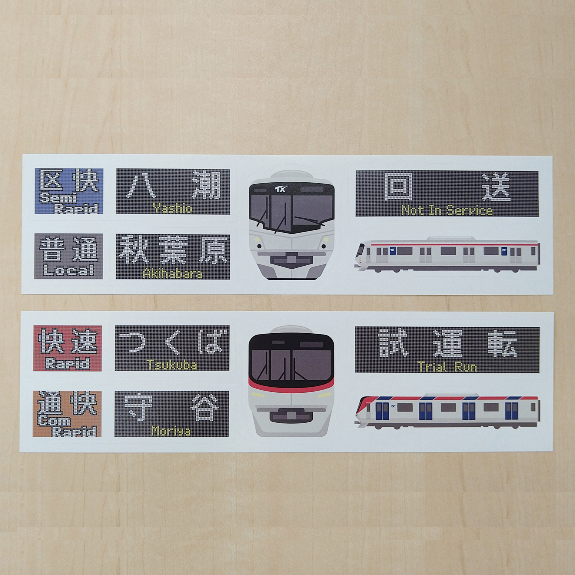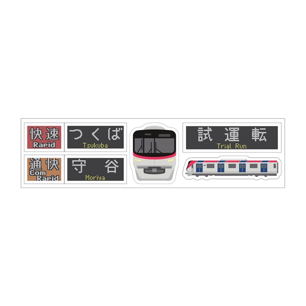TXの種別(快速・通快)、行先表示(つくば・守谷)、車両のデザインをあしらったシールとなっています。